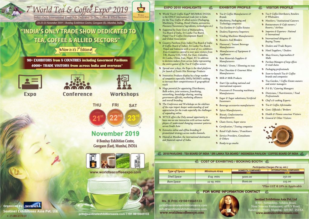 · Bombay Exhibition Centre to host the 7th World Tea Coffee Expo from 21 – 23 Nov 2019